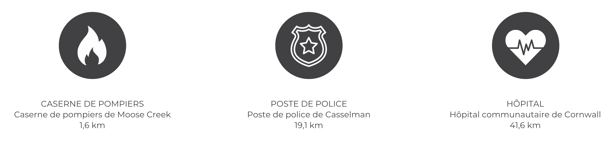 Idéalement situé, Moose Creek se trouve à seulement 20 minutes de Cornwall, à 40 minutes d’Ottawa et à moins d’une heure de Montréal — alliant la tranquillité d’une petite ville à un accès facile à la vie urbaine.